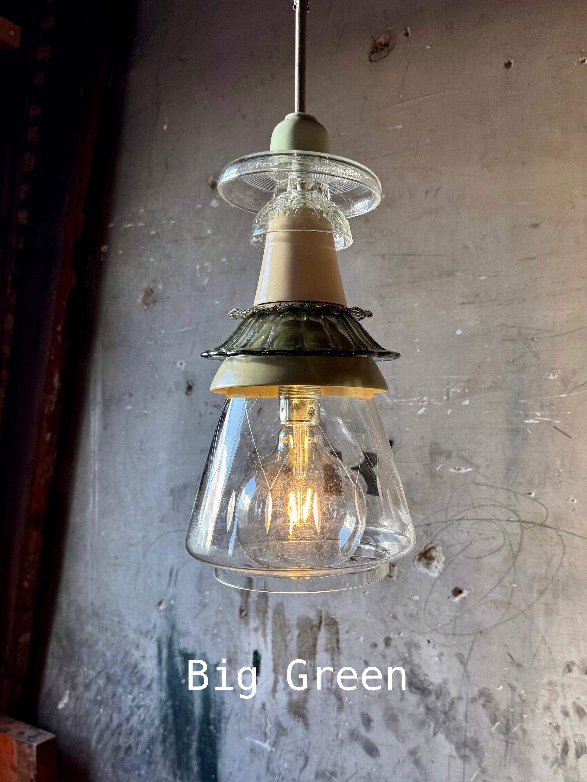 Een stoere Keukenlamp met een grote geslepen glazen kap gecombineerd met groen keramiek, oud zilver en transparant glas