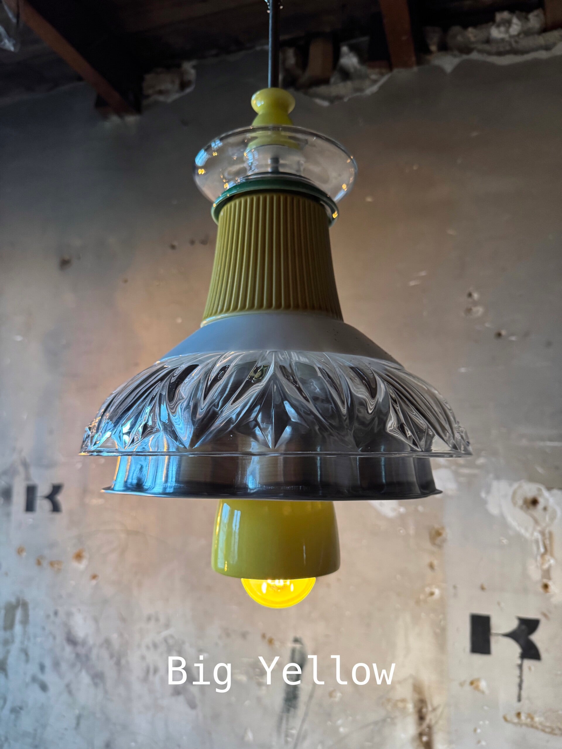 Deze keukenlamp met een knipoog naar de keuken, heeft een dubbel kap van geslepen glas en blik. Geel, groen en wit keramiek en hand geblazen glas.