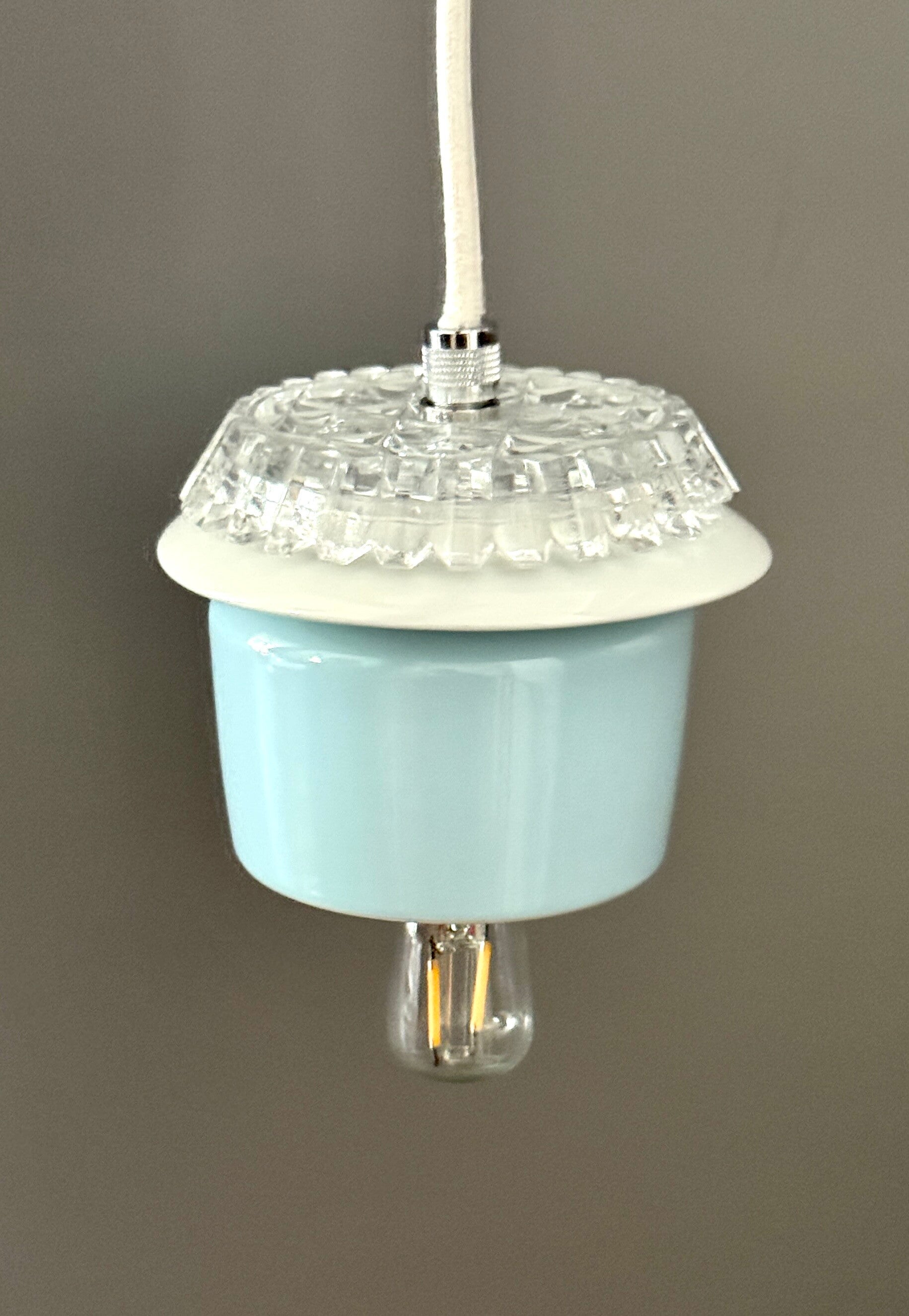 De flat White is een 12 cm hoog blauw en wit keramiek met een klein plat glazen kapje van geslepen glas . Afgewerkt met metaal kleurige onderdelen.